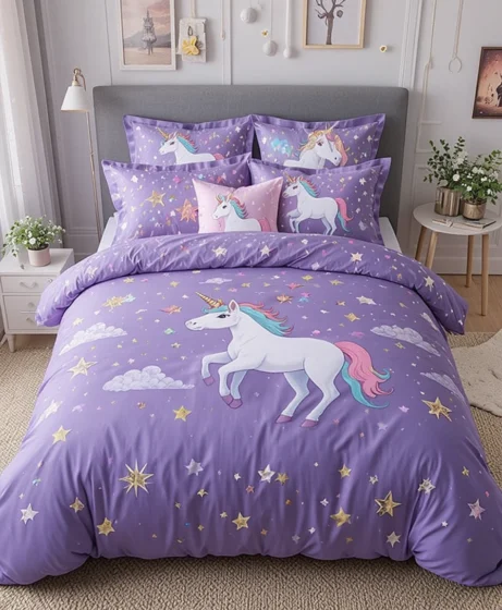 Choose unicorn bedding with soft patterns and breathable fabric for daily comfort. Subtle prints with stars or clouds keep the look stylish instead of childish. Neutral walls help the bedding stand out beautifully.