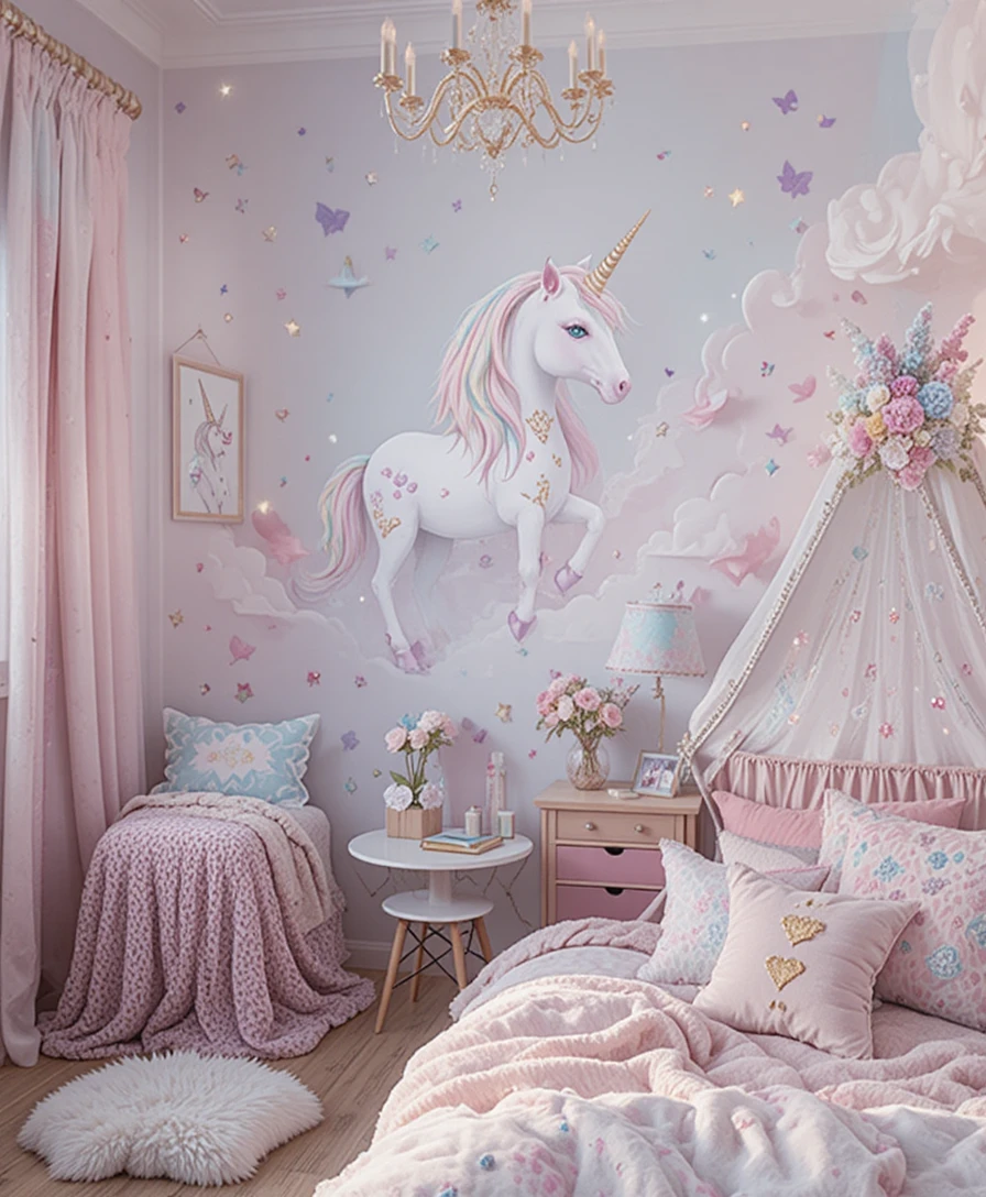 Combine unicorn art with soft galaxy-inspired wall paint. Subtle purples and blues add depth and magic. This creates a unique and artistic unicorn room atmosphere Unicorn Room Décor.