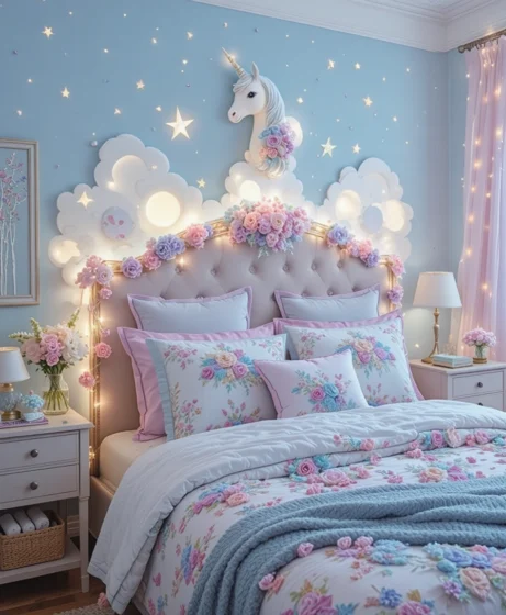 Wrap fairy lights shaped like unicorns or stars around the headboard. The gentle glow creates a calming bedtime atmosphere. It also adds visual interest without taking up extra space Unicorn Room Décor.