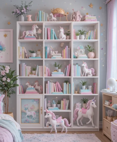 Decorate shelves with unicorn figurines, pastel books, and tiny plants. This keeps the room organized while maintaining a magical look. It’s a great balance of function and fantasy décor.