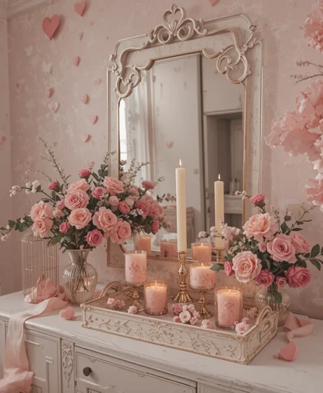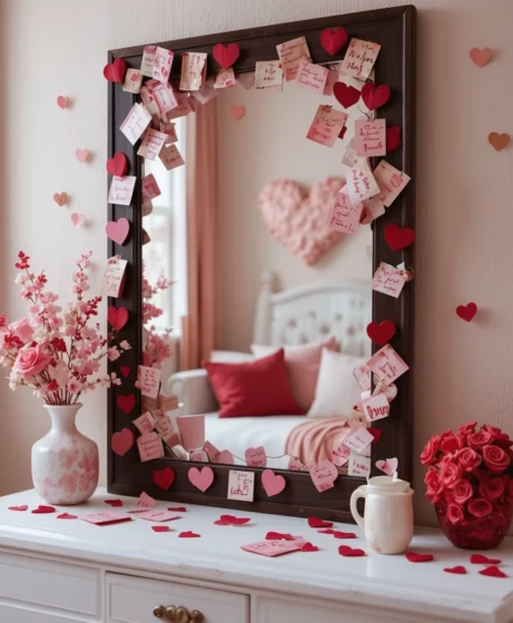 Attach small handwritten love notes or heart decals around a mirror. This turns an everyday item into a meaningful Valentine feature. It’s personal and emotionally engaging Valentine Room Decor.