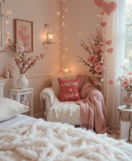 Transform a chair or corner into a romantic reading nook with throws and soft lighting. Add a small pillow with a love quote. This idea focuses on comfort and relaxation Valentine Room Decor.