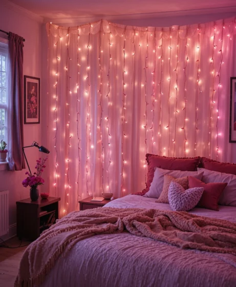 Install fairy lights in a curtain style along one wall. This instantly creates a magical and romantic ambiance. It’s a favorite Valentine room decor idea for evening settings.