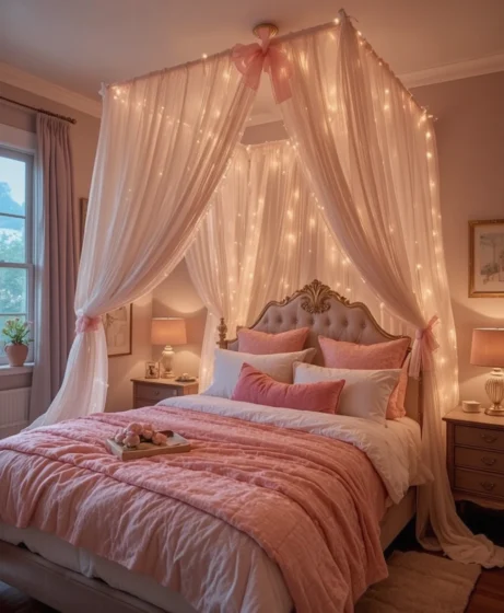 Drape sheer white or soft pink fabric over your bed to form a light canopy. Add fairy lights for a dreamy glow that instantly elevates Valentine room decor. This setup feels luxurious without being expensive Valentine Room Decor.