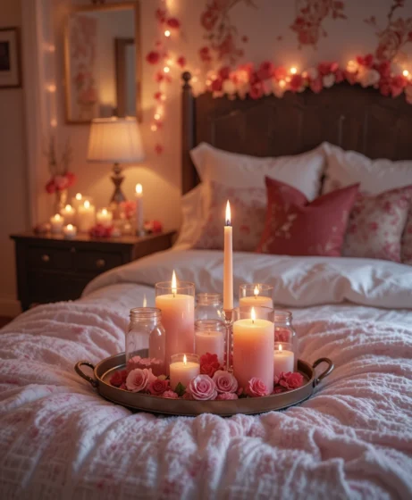 Arrange candles of different heights on trays or nightstands to create a warm, romantic mood. Use unscented or lightly scented candles for comfort. The soft flickering light makes the room feel intimate and inviting Valentine Room Decor.