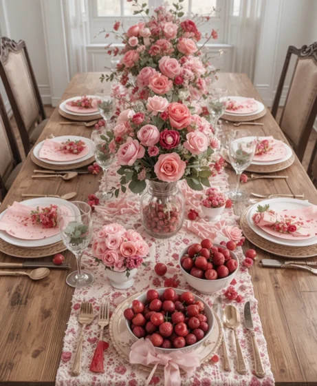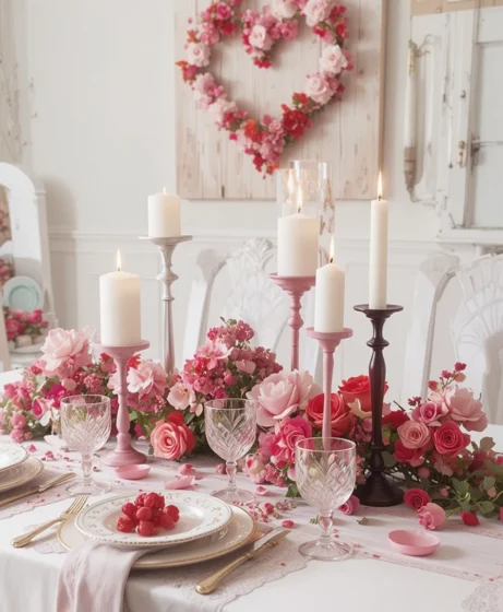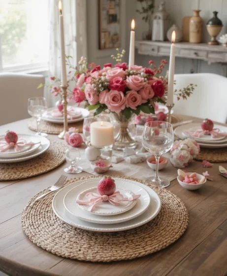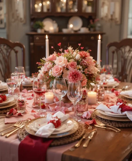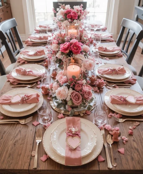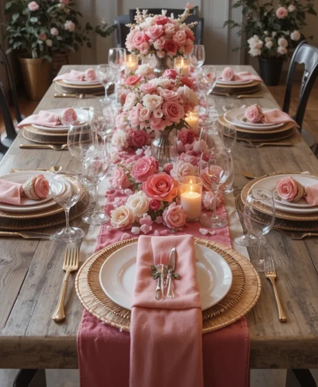 Fresh or faux pink flowers placed at the center of the table create a gentle romantic mood. Choose low arrangements so conversation flows easily. This adds charm without overpowering the table setting.