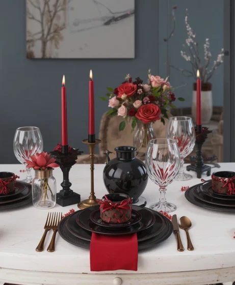 For a bold look, combine black plates with red accents. Keep decor minimal for a clean finish. This Valentine table decor idea feels modern and confident.