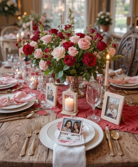 Add small framed photos or shared memories near each place setting. Keep them subtle and tasteful. This Valentine table decor idea adds emotional depth Valentine Table Decor.