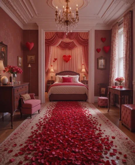 Scatter fresh or faux rose petals from the door leading to the bed or seating area. This classic setup feels dramatic yet simple. Choose deep red or blush tones to keep it elegant rather than overwhelming Valentine’s Day Room Set Up.