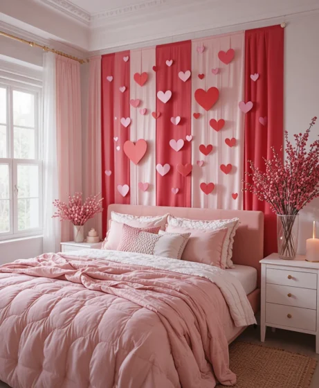 Use removable decals, paper hearts, or fabric panels to create a temporary heart accent wall. It instantly becomes a photo-worthy backdrop while keeping your space damage-free and renter-friendly Valentine’s Day Room Set Up.