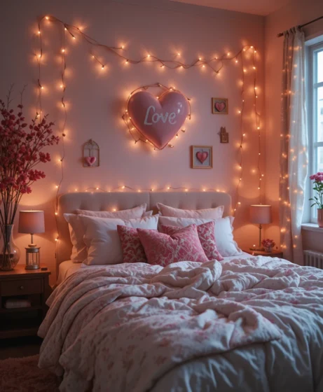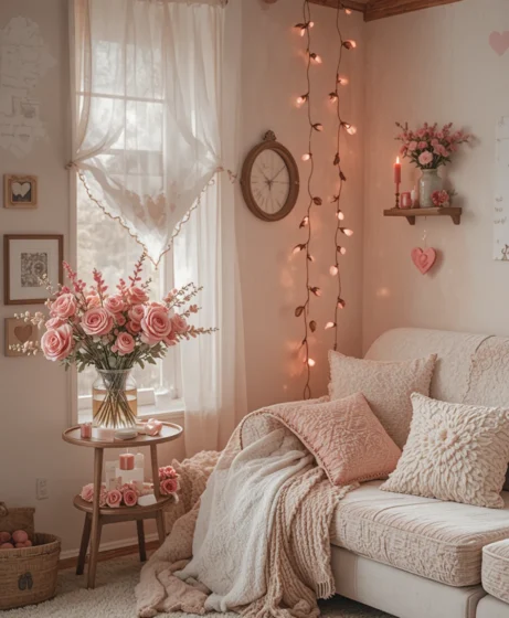 Soft string lights add a dreamy glow to bedrooms or living areas. This Valentine’s decorations for home idea works especially well in the evening.