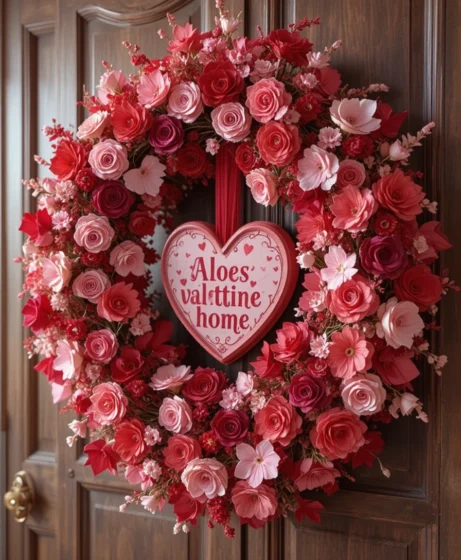 Use a Valentine wreath indoors on bedroom or hallway doors. This unexpected placement makes your home feel festive throughout Valentine’s Decorations for Home.