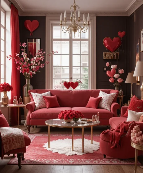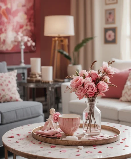 Add small Valentine figurines or vases to coffee tables and side tables. These details enhance the theme without cluttering surfaces Valentine’s Decorations for Home.