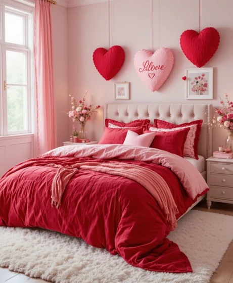 Refresh the bedroom using Valentine bedding, cushions, or fabric décor. Soft textures help the space feel romantic and relaxing.