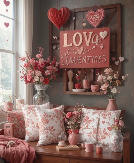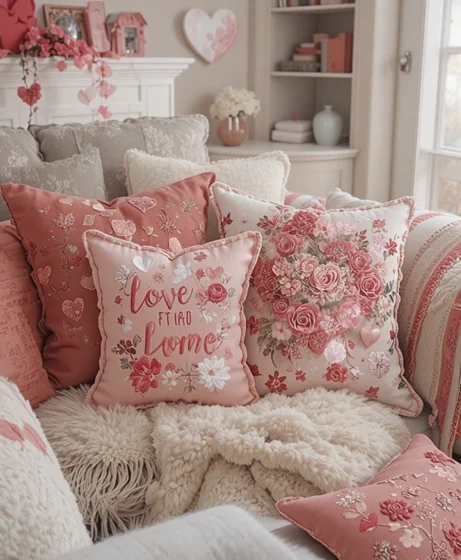 Swap everyday pillows for Valentine-themed throw pillows with hearts or loving phrases. This adds a festive touch without overpowering your existing décor Valentine’s Decorations for Home.