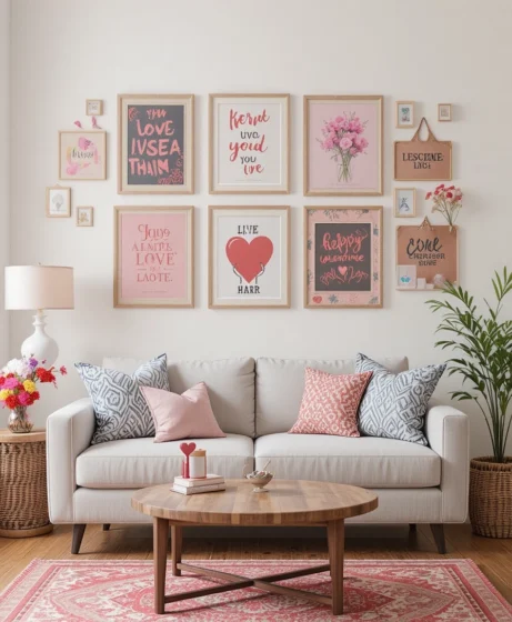 Decorate your walls with romantic prints or framed quotes. This Valentine’s decorations for home idea adds personality and makes the space feel thoughtful.