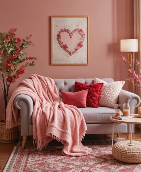 Drape lightweight throws over sofas or chairs. Soft Valentine colors bring comfort while visually warming up the room Valentine’s Decorations for Home.