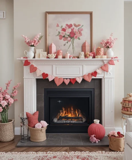 Hang a heart or love-themed garland on shelves, stair rails, or mantels. Garlands are versatile and easy to remove after the holiday Valentine’s Decorations for Home.
