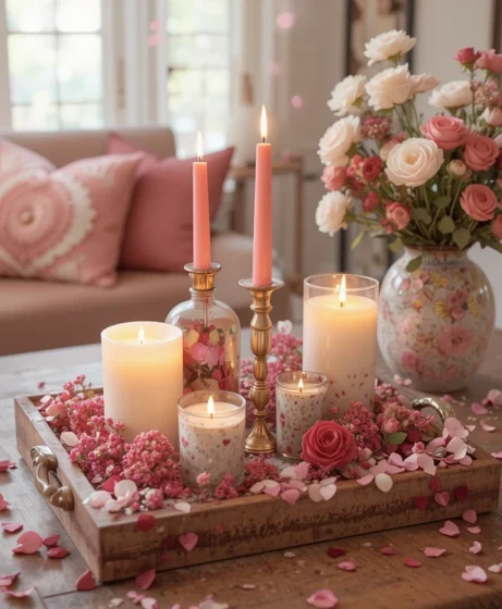 Style trays with candles, flowers, and small heart accents. This keeps décor organized while creating a romantic focal point.