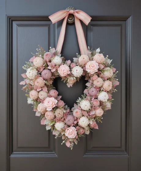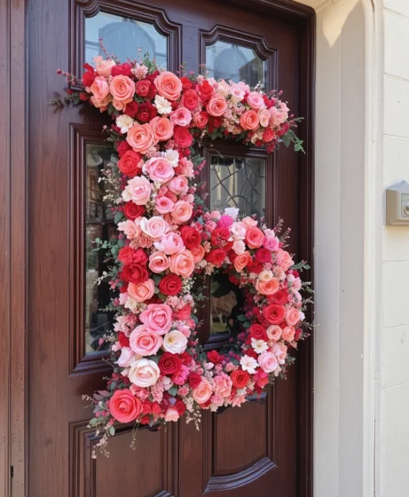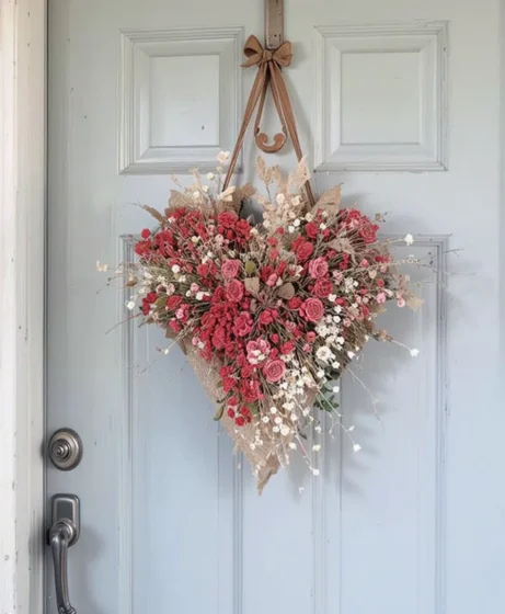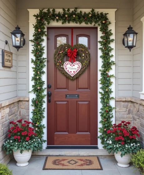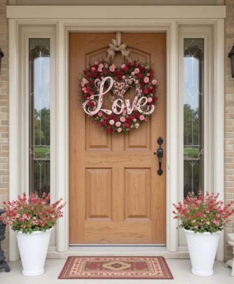 A heart-shaped wreath made with faux greenery, soft florals, or fabric instantly sets a romantic tone. Choose muted reds or blush shades for a modern look that feels stylish rather than overly bold Valentine’s Door Decorations.