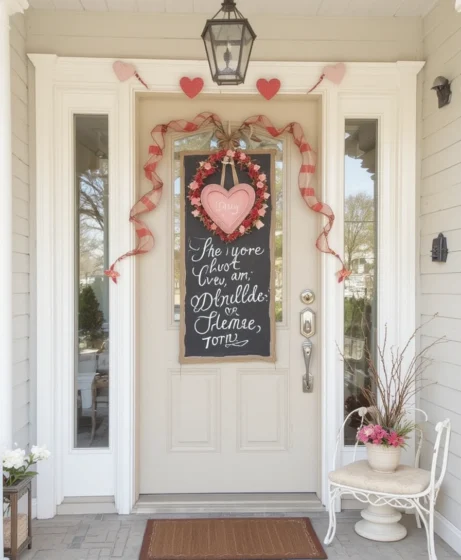 A chalkboard sign with a handwritten Valentine message adds a personal and creative touch. It’s easy to update and perfect for DIY lovers Valentine’s Door Decorations.