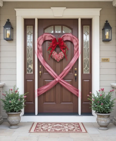 Wrap soft ribbons around the door in heart or crisscross patterns. This unique idea feels elegant and transforms the door without needing extra décor.