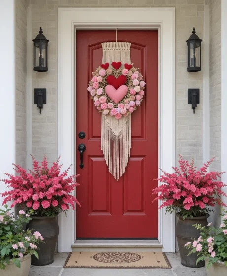 Use macramé hangings with heart accents for a bohemian Valentine look. This style feels relaxed, artistic, and perfect for modern boho homes Valentine’s Door Decorations.