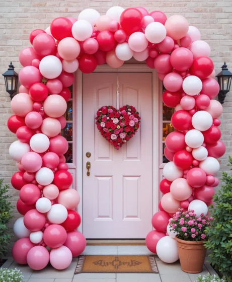 Create a balloon arrangement around the door frame using soft pinks and whites. It’s festive, bold, and perfect for Valentine’s parties or surprises.