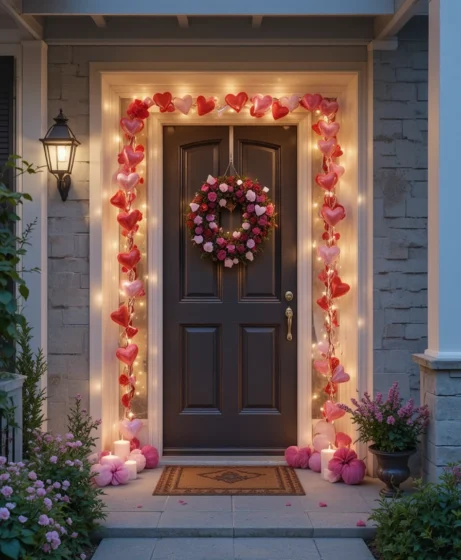 Outline the door with soft string lights for a glowing Valentine entrance. This works especially well for evening décor and creates a romantic atmosphere.