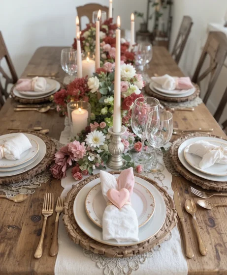 Layer multiple candles at different heights for a warm glow. This Valentine’s tablescape relies on lighting rather than heavy décor, making it feel cozy and emotionally intimate.