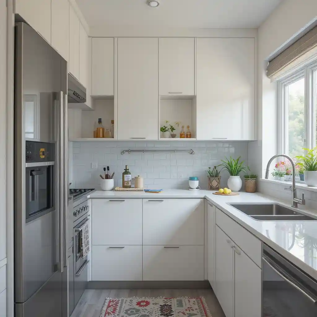 Install shelves above windows or add a small herb garden on the sill. This makes the most of natural light and adds greenery. It brings charm and freshness to tiny kitchens.
