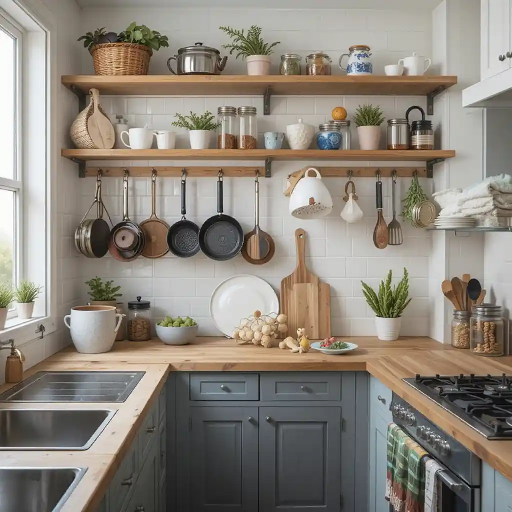 Hooks and racks on walls free up cabinet space. Store pans, utensils, and mugs neatly. This keeps everything within reach without crowding counters. Very Small Kitchen Ideas
