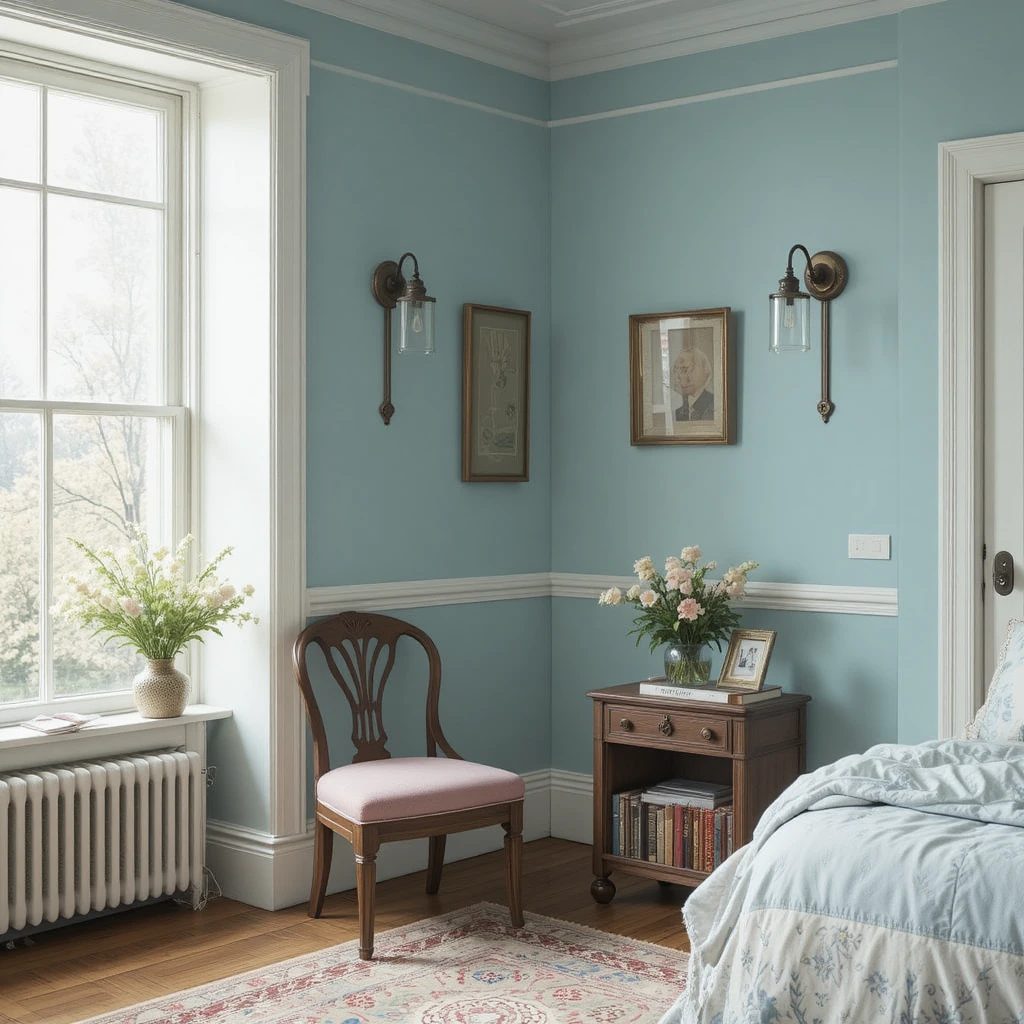 A powder blue wall brings gentle serenity and pairs beautifully with white molding and vintage light fixtures. It’s perfect for bedrooms or cozy reading corners.