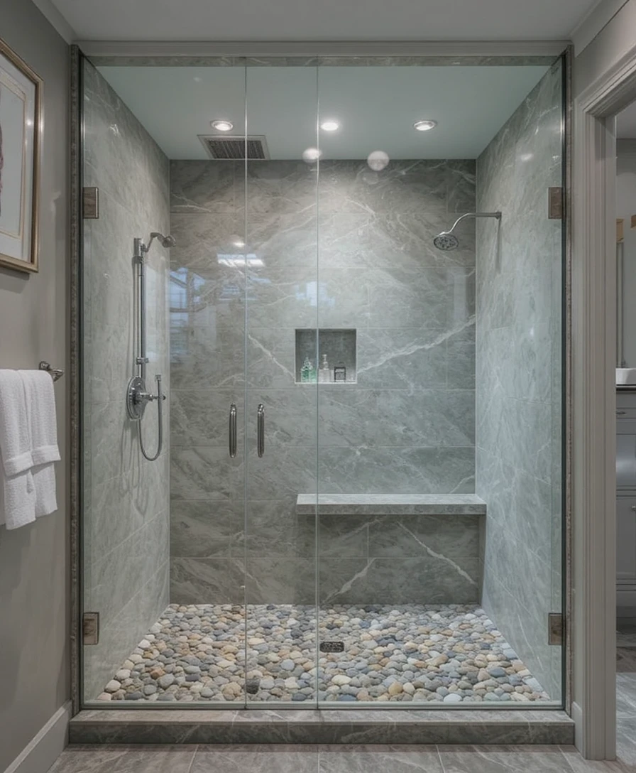 Pebble or stone floors add a natural spa-inspired texture to your shower. They’re slip-resistant and comfortable underfoot. Pair them with soft lighting for a relaxing, nature-inspired retreat. Walk-In Shower Designs