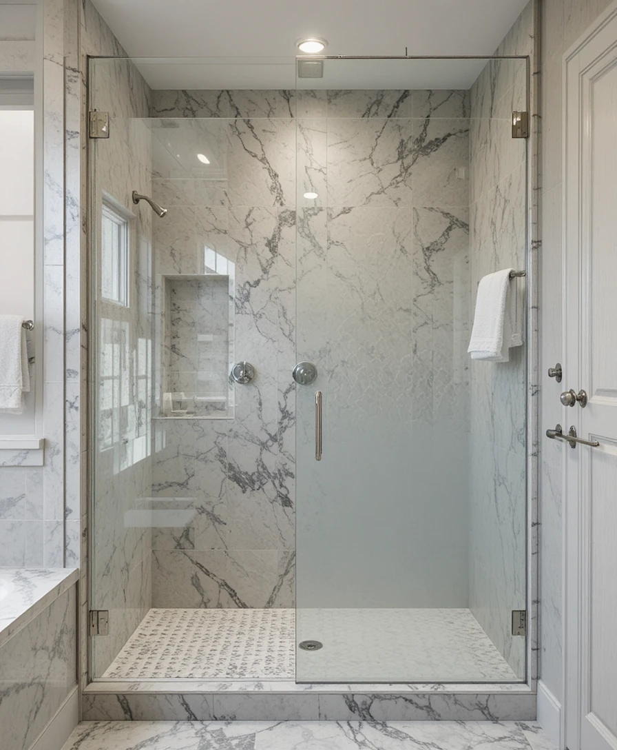 For more privacy without sacrificing style, opt for frosted or patterned glass. It provides a soft, diffused light effect while keeping the shower space private and elegant.