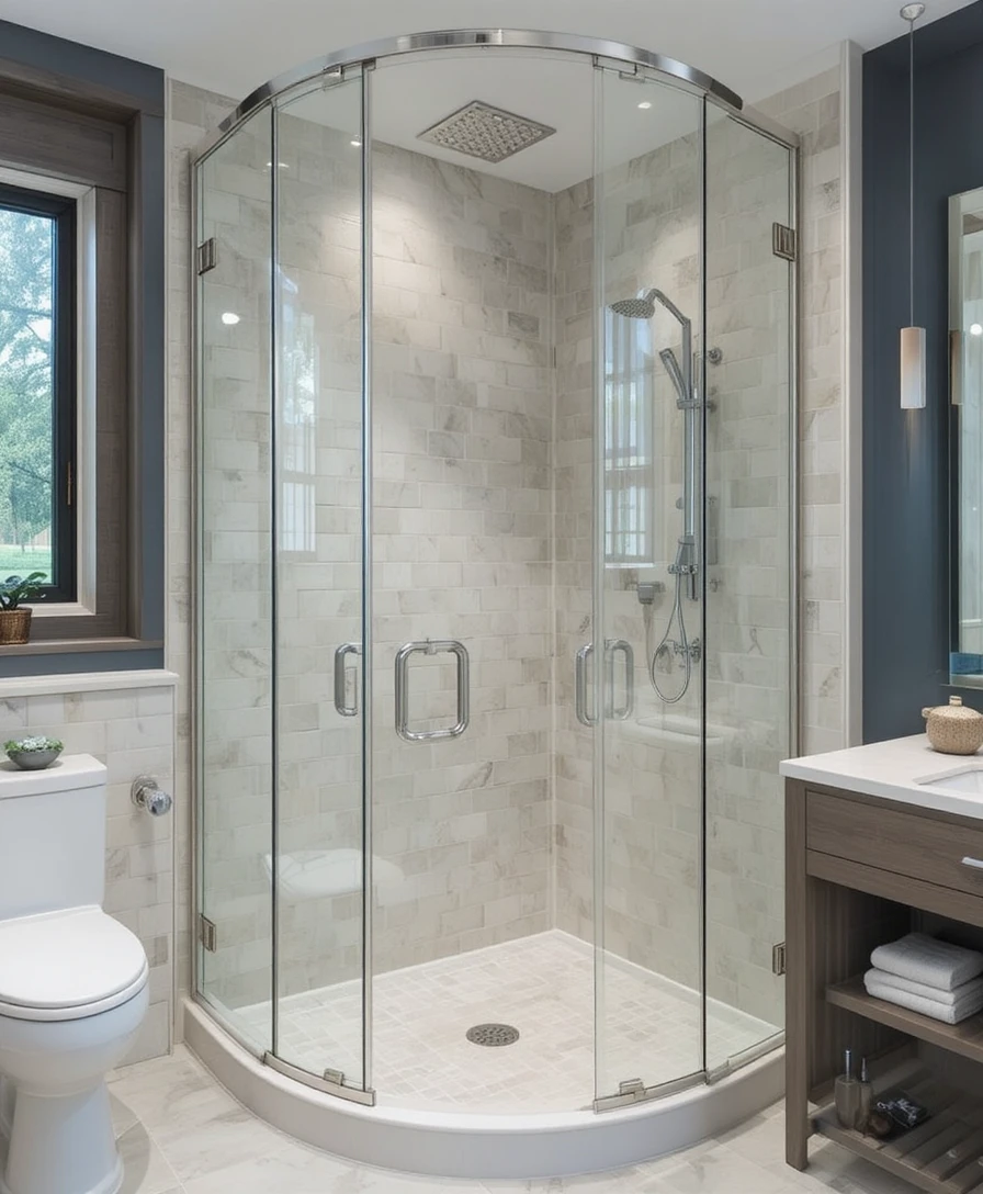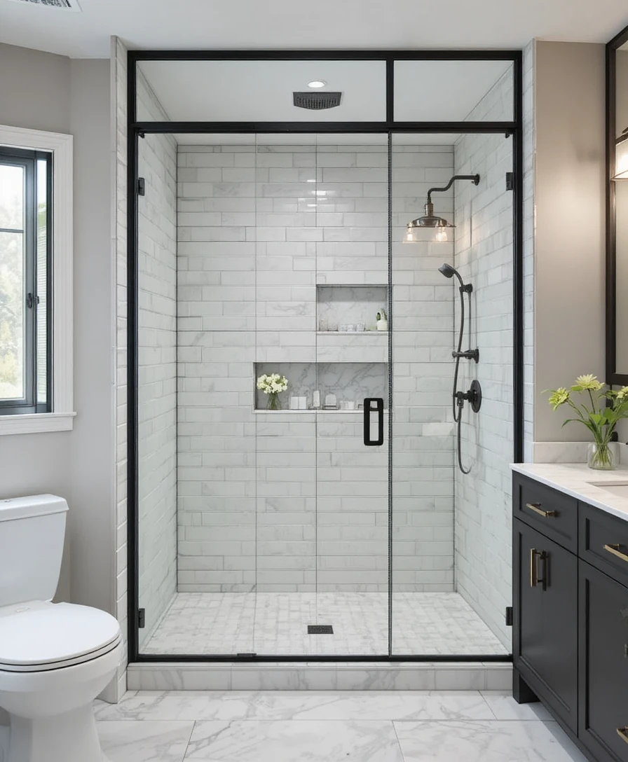 For a bold and trendy statement, go for a black-framed glass enclosure. It adds a touch of industrial elegance while keeping the space sophisticated. Pair it with white subway tiles or marble for contrast.