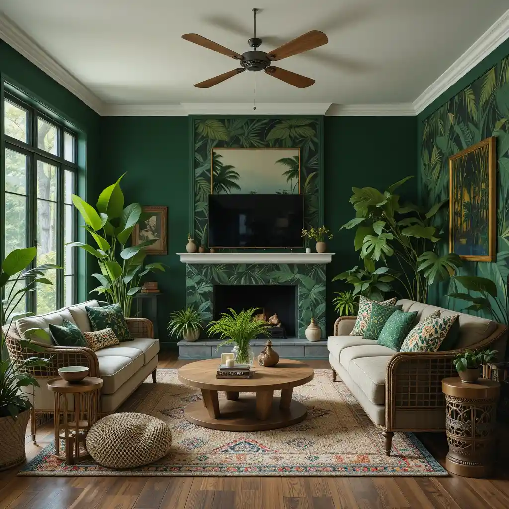 Paint your walls in shades like emerald, jungle green, or moss to instantly create a rich, tropical foundation that feels immersive and calming.