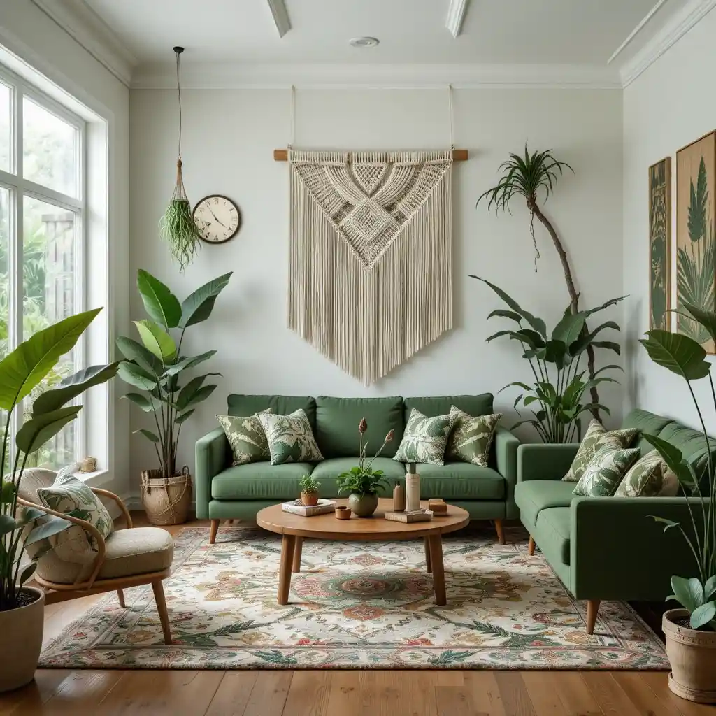 Suspend trailing plants like pothos or philodendrons in macramé hangers to introduce greenery at various eye levels.