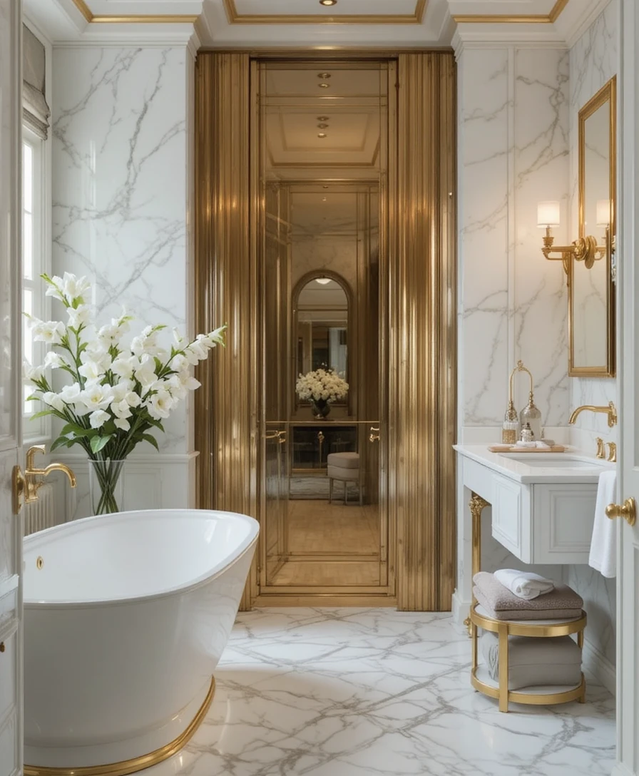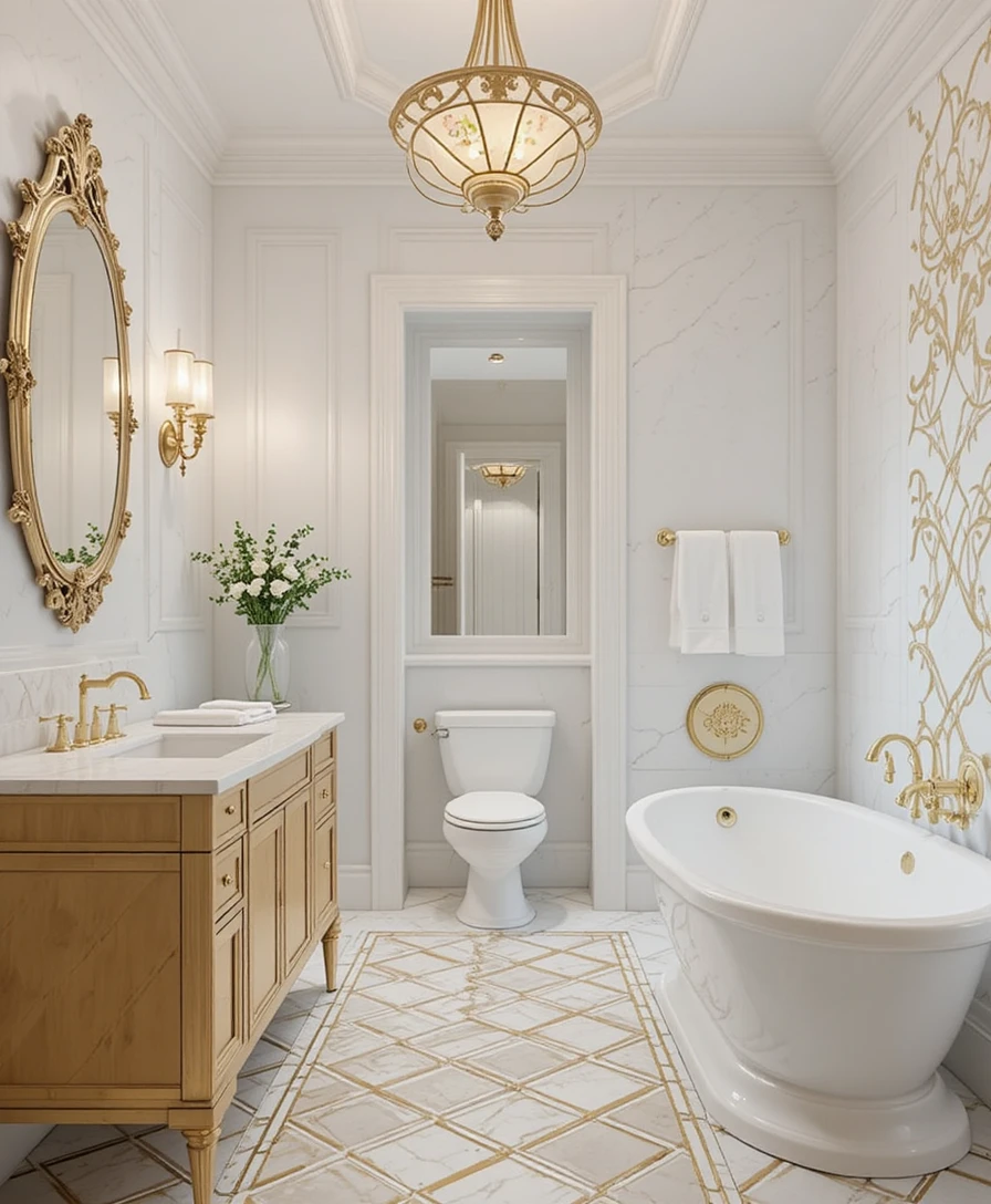 Design a feature wall with a mix of white textures and gold patterns. It becomes the centerpiece of the bathroom while keeping the space bright and stylish. White and Gold Bathroom