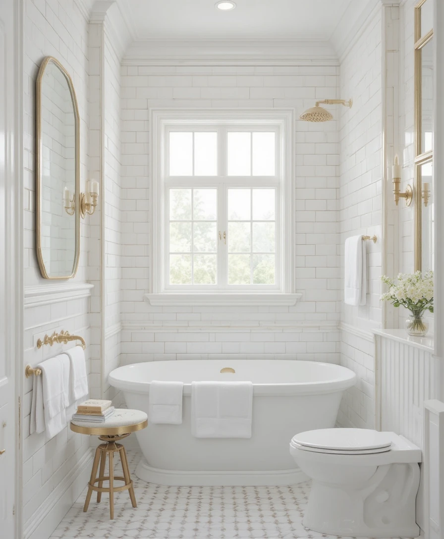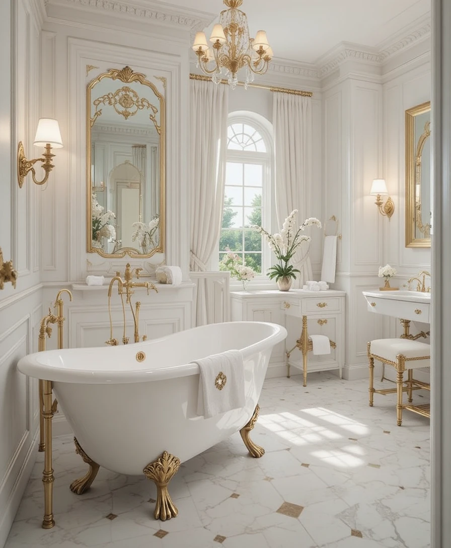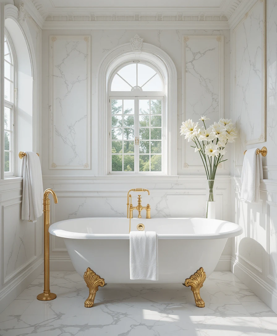 Add a freestanding white bathtub with gold claw feet for a vintage luxury touch. Pair with soft lighting to create a relaxing, spa-like environment. White and Gold Bathroom