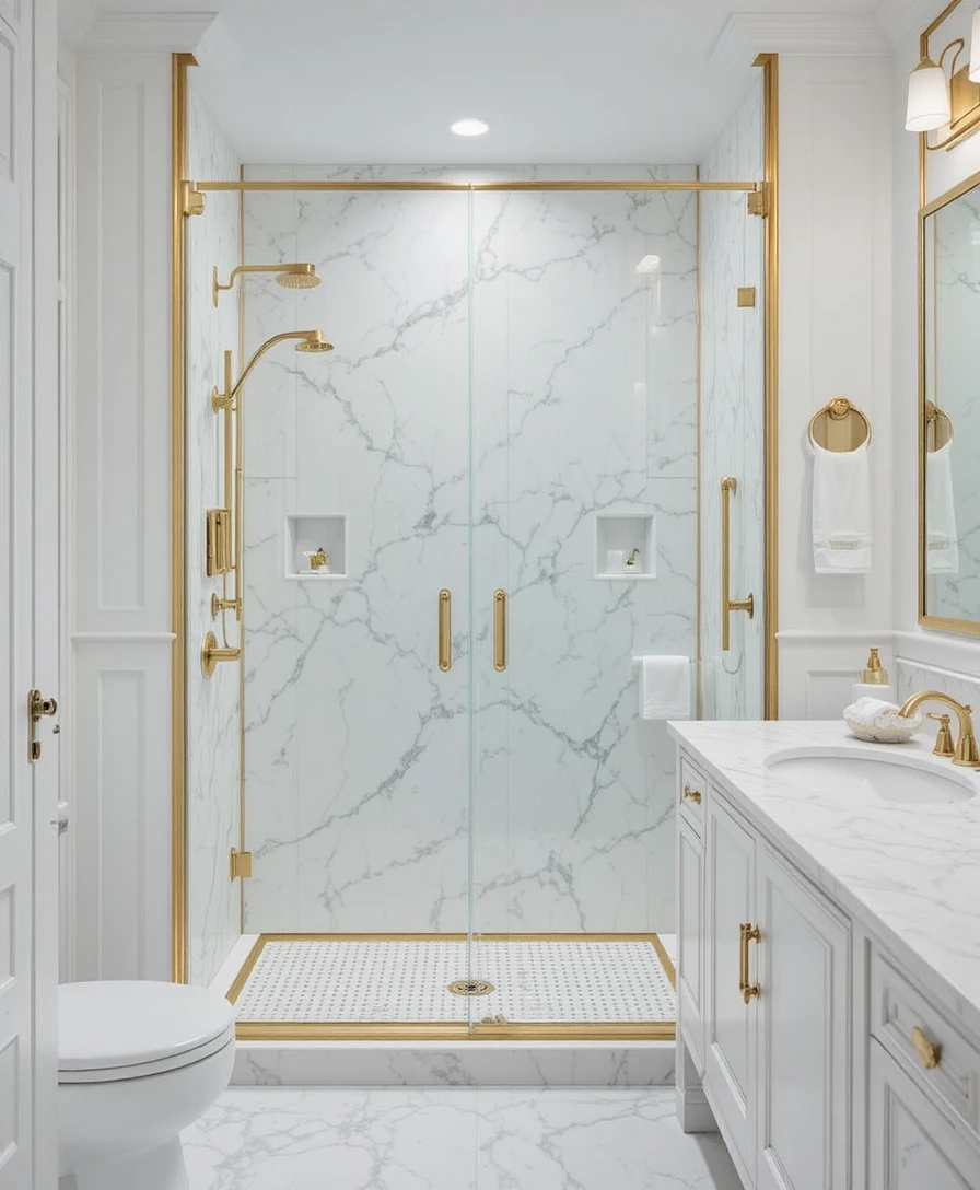 14. White Marble Shower with Gold Trim
