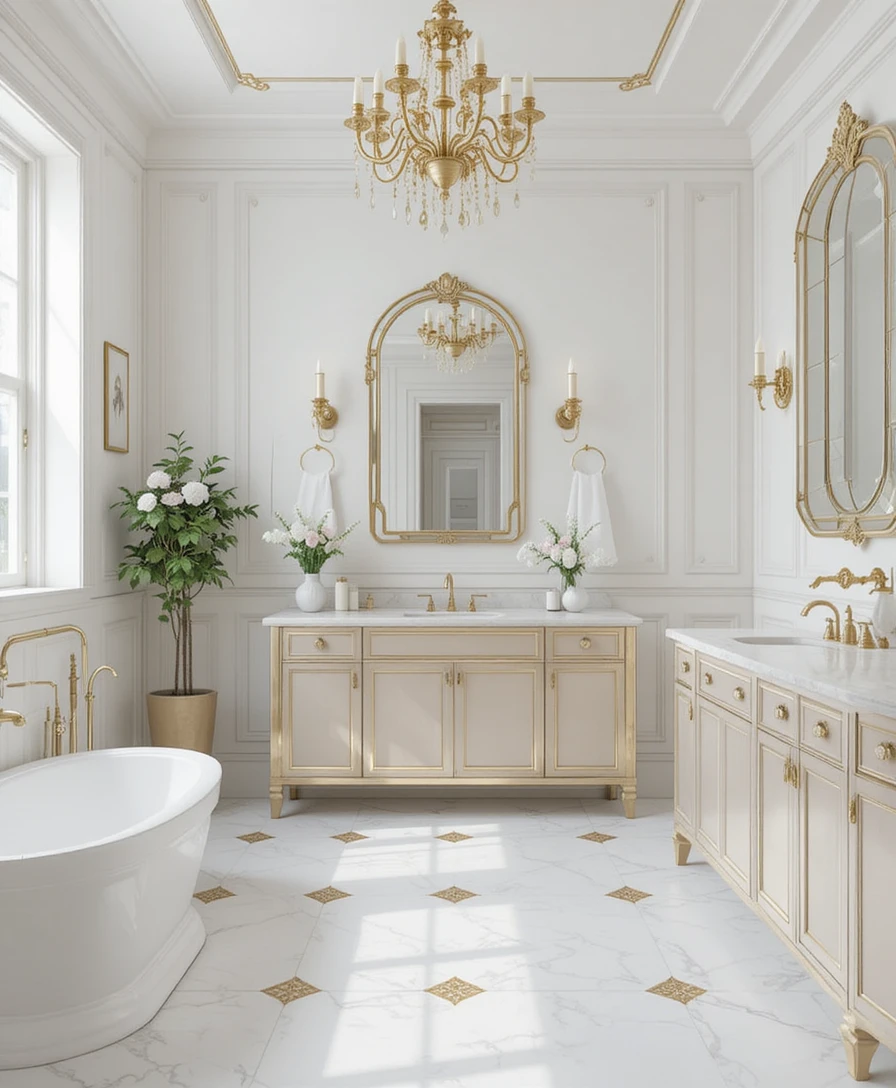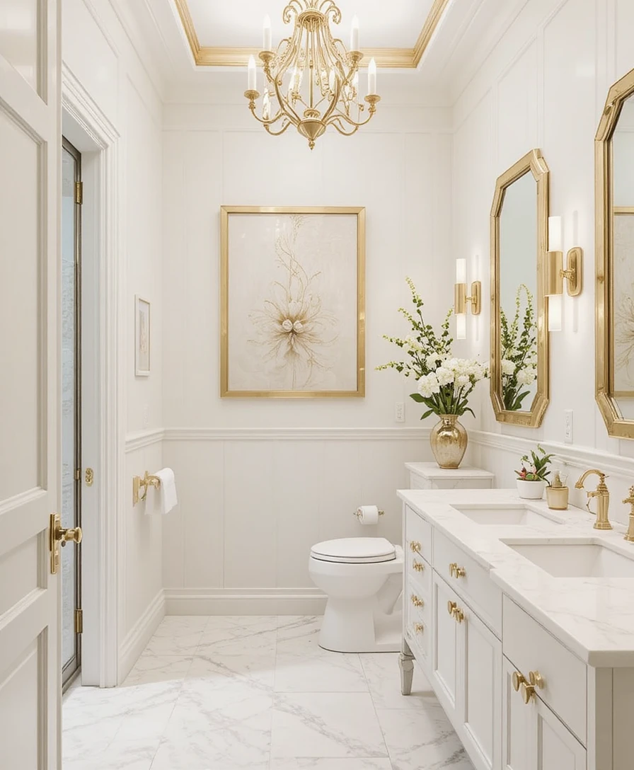 Use gold-framed mirrors above sinks or vanities to instantly elevate the room. They reflect light beautifully and enhance the white and gold aesthetic.