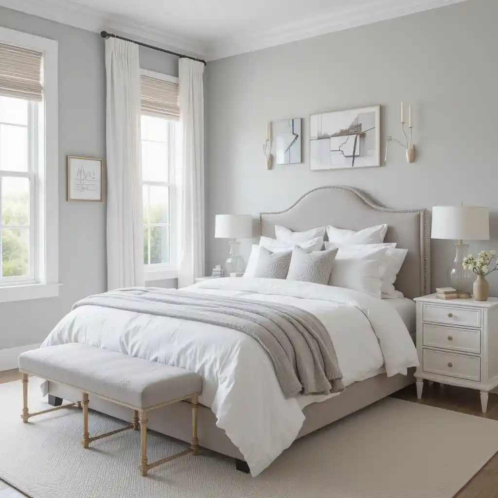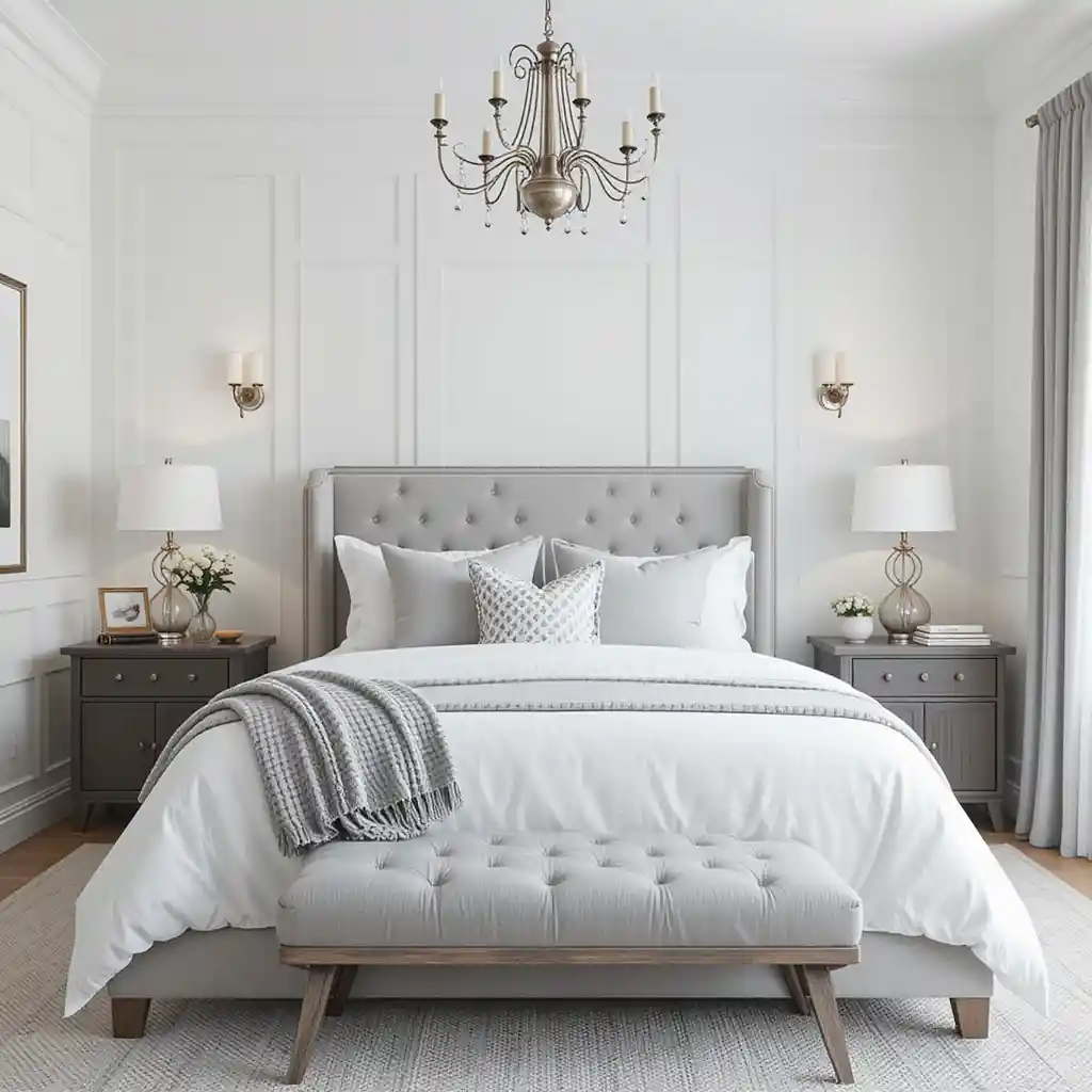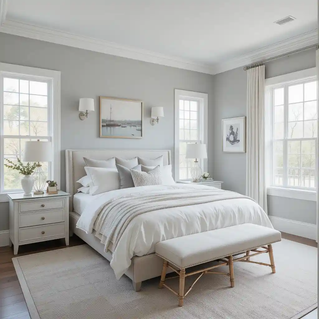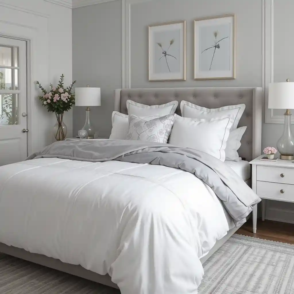 Choose a light grey paint for the walls to establish a calming mood. Pair it with crisp white bedding for a clean, fresh feel that never goes out of style.