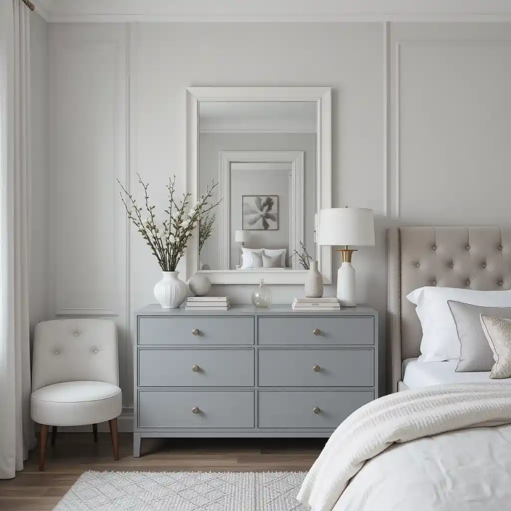Pair a matte grey dresser with a sleek white-framed mirror above it to create a chic and balanced focal point in your bedroom. White and Grey Bedroom