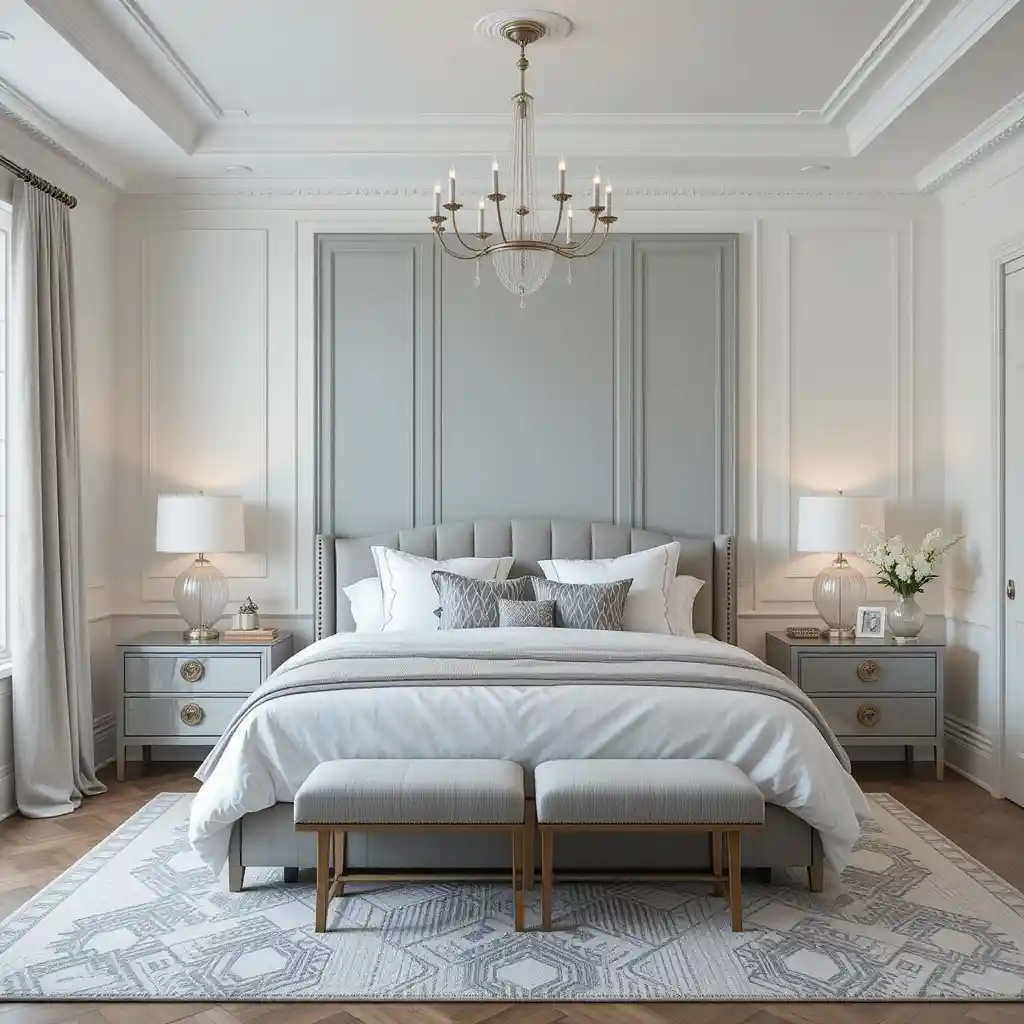 Add decorative wall panels in grey behind your bed or around the room. The white ceiling and trim will brighten and lift the whole space. White and Grey Bedroom