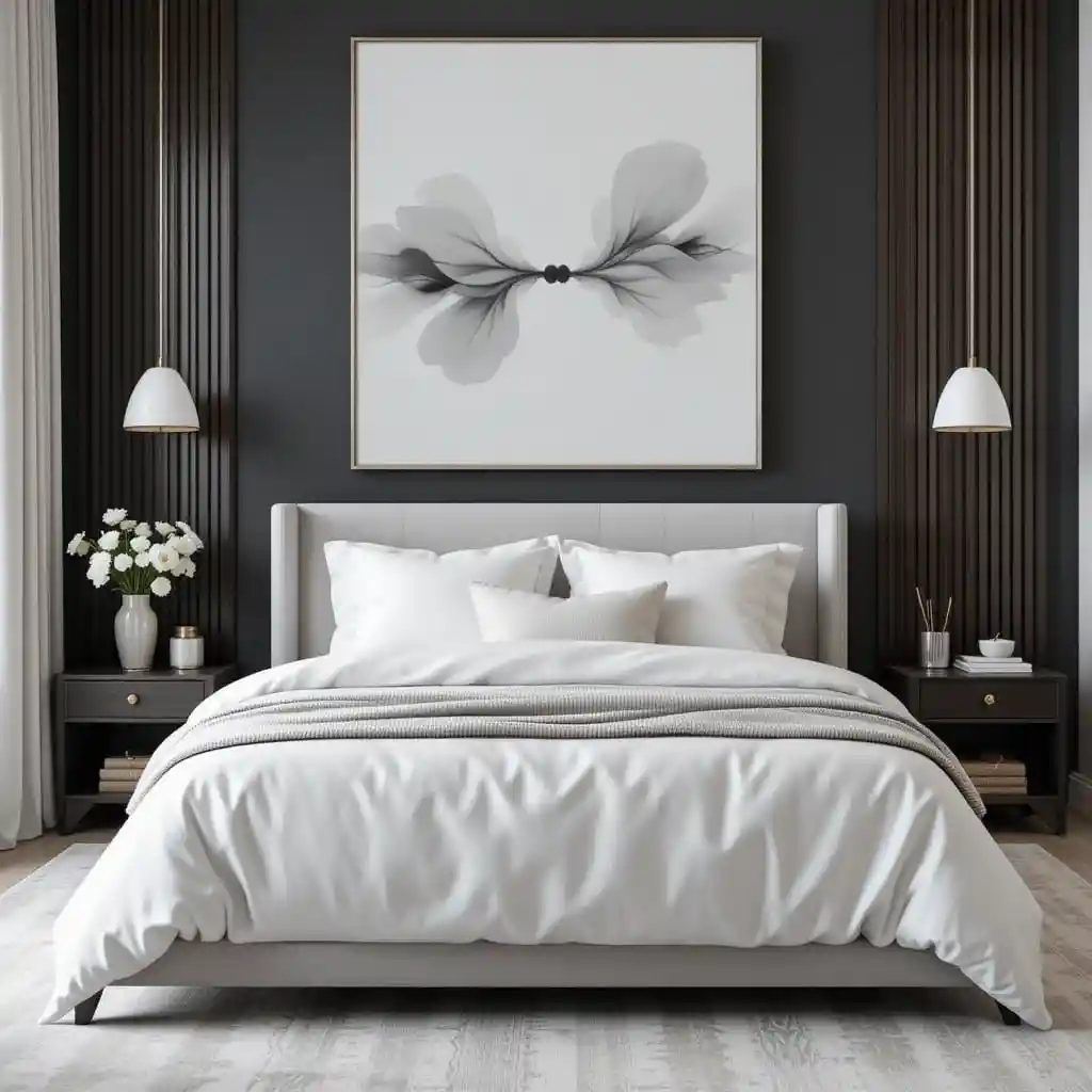 Hang a large monochrome painting or abstract art in grey and white tones. It brings subtle personality without overwhelming the minimalist palette.