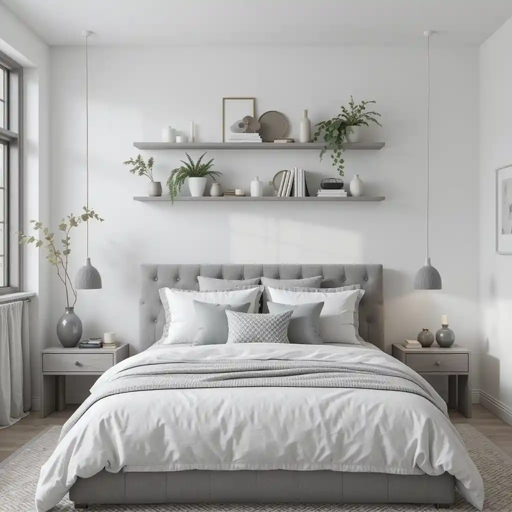 Install minimalist floating shelves in a cool grey finish to display plants, books, or candles against a clean white background. White and Grey Bedroom