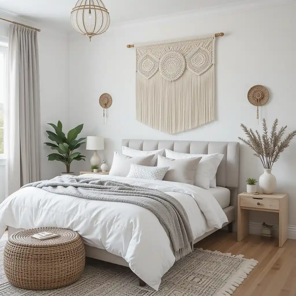 Use macramé wall hangings in off-white, mix with grey-toned throws and rattan accessories for a boho-inspired neutral room full of charm and comfort. White and Grey Bedroom