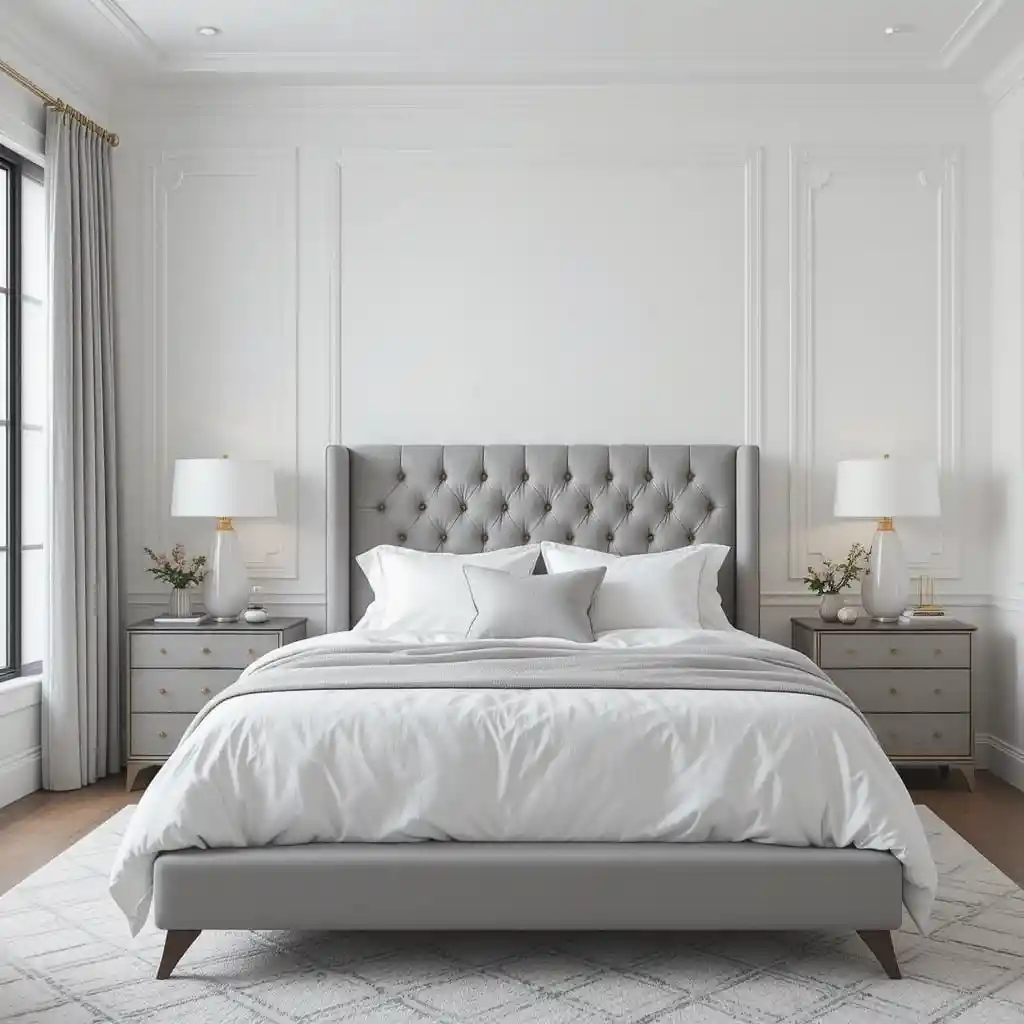 Create a soft focal point by choosing a tufted grey headboard or bed frame. The grey tones stand out beautifully against a white backdrop.
