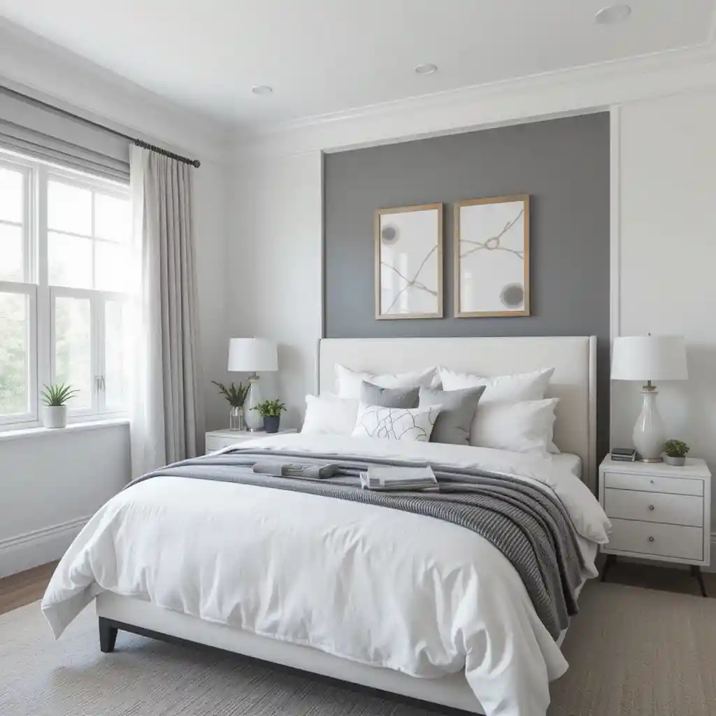 Use a deeper grey shade for the wall behind your bed to add drama. Keep the bed frame, sheets, and accessories in white for a crisp balance.
